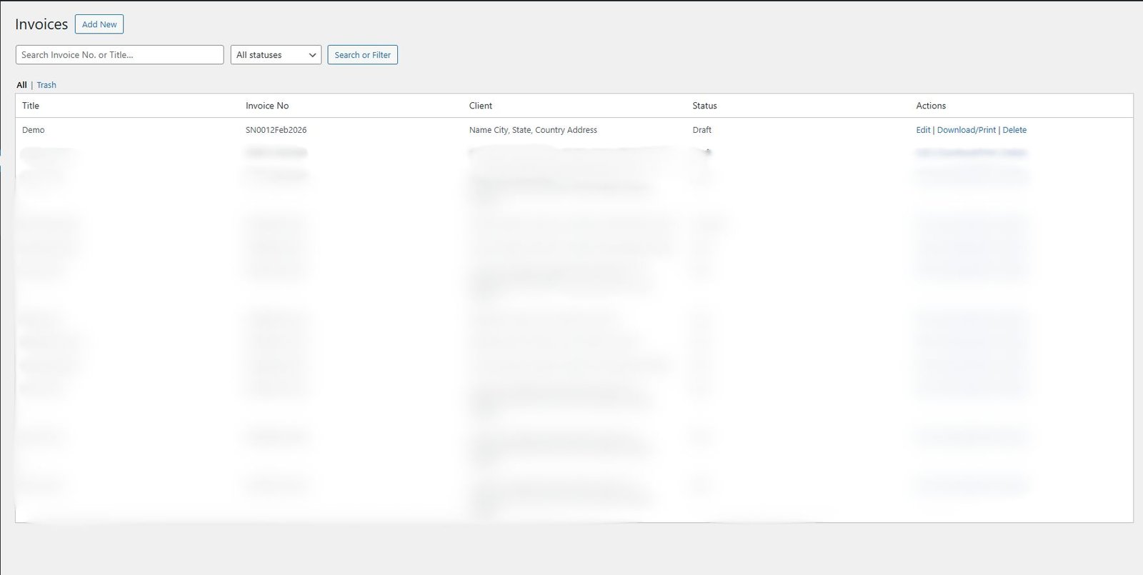 The Invoice List page is a comprehensive dashboard that displays all of your invoices in a structured, easy-to-navigate table. Each row provides a snapshot of key details: the invoice title, unique invoice number, client name, status (such as Draft, Sent, Paid, or Overdue), and action options (Edit, Download, Delete). With a search bar, users can quickly find specific invoices by number or title, and the status filter allows them to narrow down results based on progress. This page ensures complete visibility and efficient invoice management.