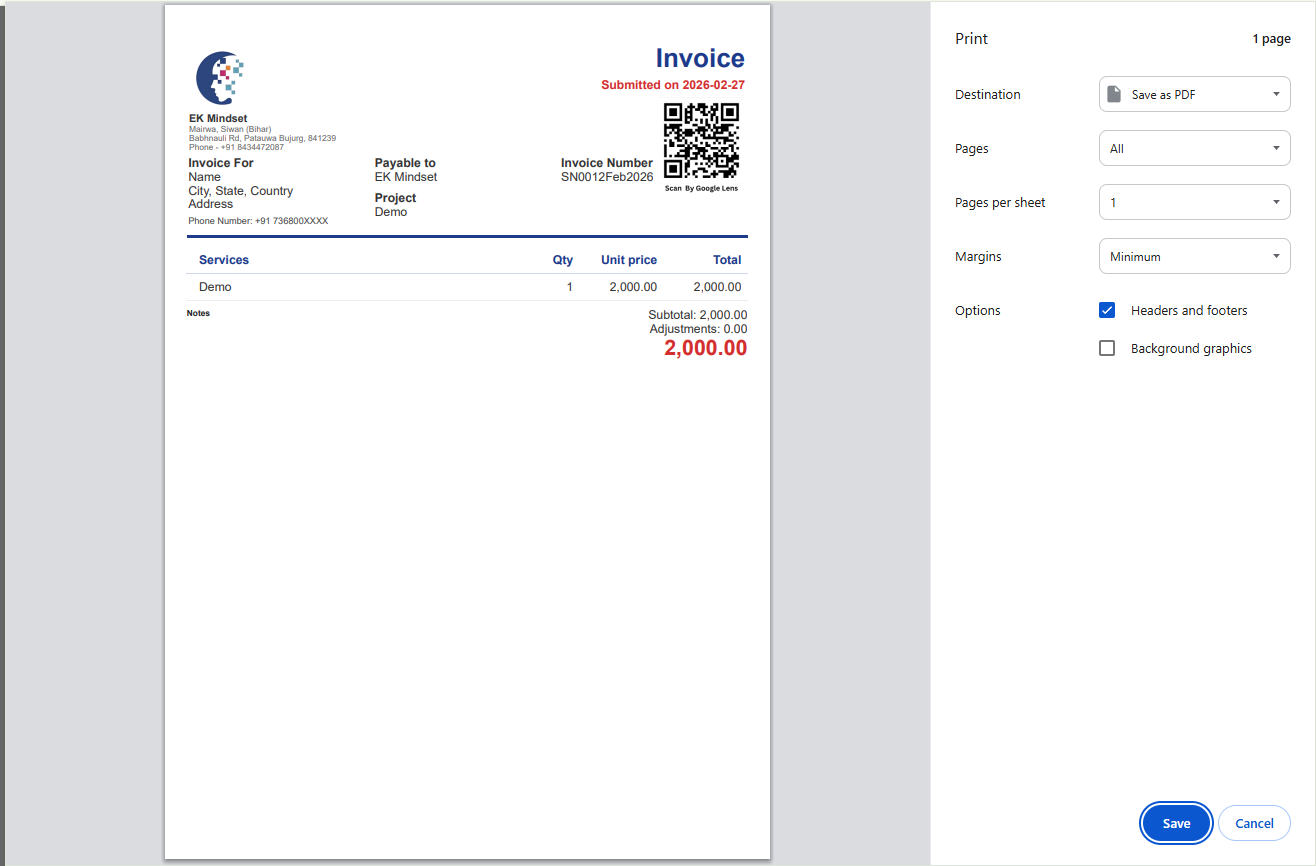The Invoice PDF is a beautifully structured document that provides a professional snapshot of the entire transaction. It features the company’s branding—name, address, phone number—alongside the client’s details, project, and due date. A clear breakdown of services, quantities, unit prices, and totals is presented. Adjustments, if any, are deducted from the total, and the overall amount is prominently displayed in bold. The inclusion of a scannable QR code further facilitates instant payments, making the invoice both elegant and functional.